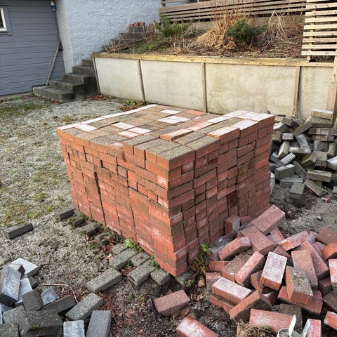 Murstein i blanding av rød. Steinene ser ut til å være brukte og har noe rester av mørtel. Egner seg til murerarbeid, hageprosjekter eller andre byggeprosjekter der utseende ikke er avgjørende. Antall og eksakte mål er ikke spesifisert, men steinene har standard rektangulær mursteinsform.