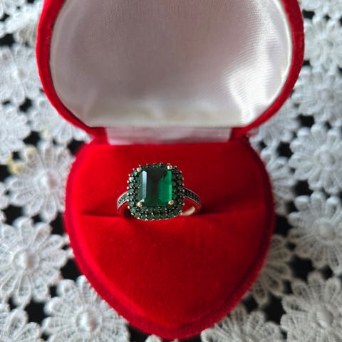 Aleksandritt er kjent for sitt unike fargespill og skifter nyanse avhengig av lysforhold. Steinen har en nydelig lillatone som fremheves av de klare stenene rundt. Ringen har et delikat og feminint uttrykk og passer både til hverdags og spesielle anledninger.