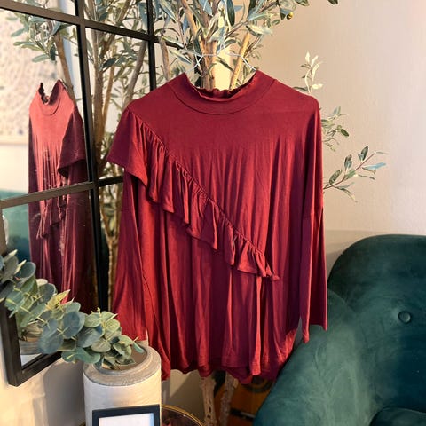 Vide ballong ermer, pen høy krage. Skjulte knappe. Veldig behagelig på. Like fin til bukser som skjørt både til hverdags og fest.