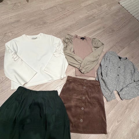 Ullskjørt i lekker dus mørkegrønn farge. Størrelse M. Kr 400. Selger også en vakker bluse fra Saint Tropez som passer veldig fint til skjørtet. Kr 200. Jeg selger også en vakker ny og ubrukt WolLand cardigan som også passer til. Kr 950 (er utsolgt og kostet 1900,-)