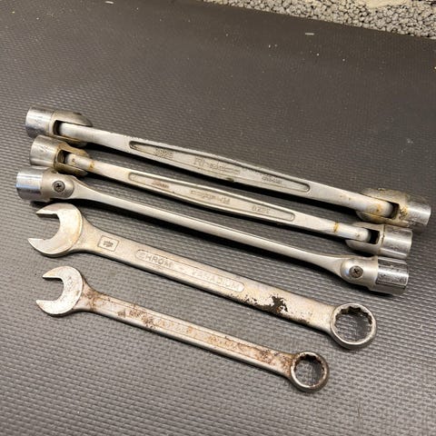 Selger et parti originale DOWIDAT ringnøkler og leddnøkler i chrom vanadium-stål. Dette er eldre kvalitetsverktøy laget for tung og reell verkstedbruk, med solide ledd og kraftig gods.