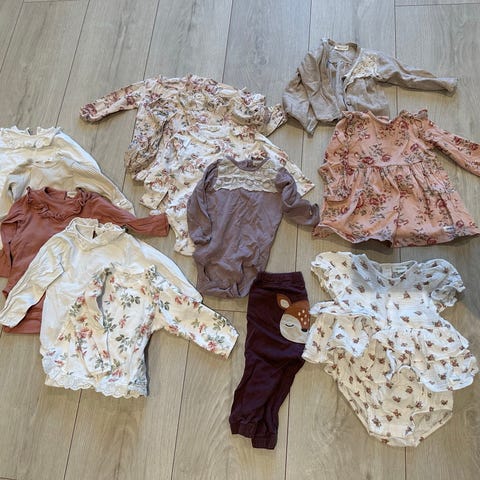 Inneholder 2 kjoler, sparkebukse, 4 bodyer (1 ull), 2 pysjamas, 3 bukser, jakke og 2 topper.