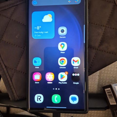 Samsung Galaxy S23 Ultra mobiltelefon med 256 GB lagringsplass. Modellen har stor berøringsskjerm og flere kameraer på baksiden for ulike fotoinnstillinger. Enheten passer for brukere som ønsker god lagringskapasitet til apper, bilder, video og andre filer. Fargen fremstår som svart/mørk, og telefonen har et kantet design med fysiske knapper på siden.