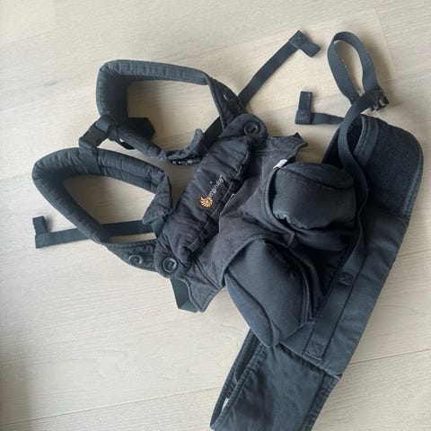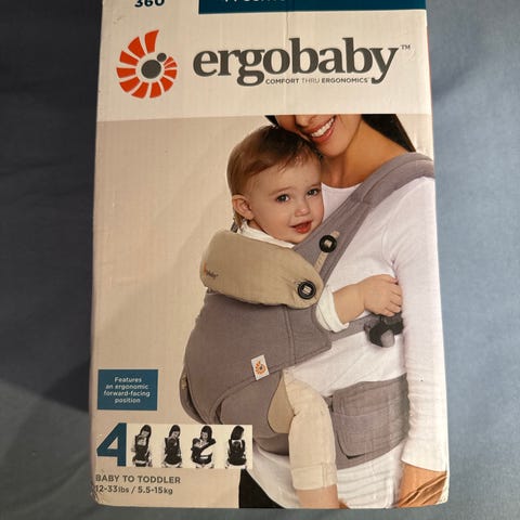 Ergobaby bæresele i grått stoff. Innsiden er mykt polstret for økt komfort. Egnet til å bære barn på mage, rygg eller på siden, avhengig av barnets alder og behov. Det er synlig slitasje på enkelte sømmer og kanter, se bilder for detaljert tilstand. Dette er en gammel modell. Bæreselen har mye bruk igjen. Selges fordi vi har kjøpt en ny.
