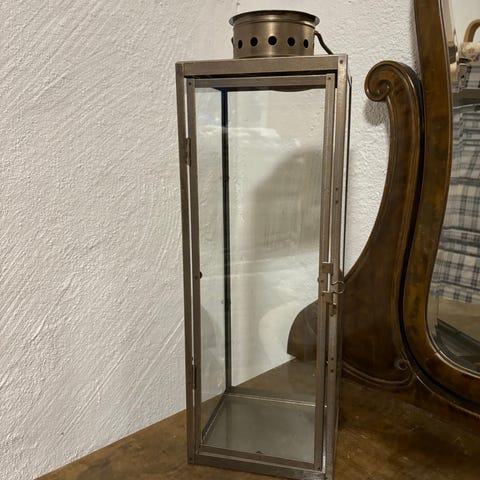 lykt i rektangulær form med ramme i tre og sider i glass. Lykten har kryssformede trelister på sidene og metallhåndtak på toppen. Egnet til bruk med lys eller som dekorasjonsobjekt innendørs eller under tak utendørs, avhengig av behov og egen tilpasning.