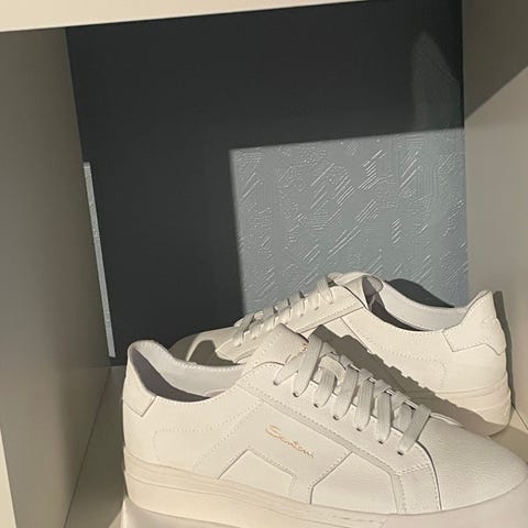 Stilige sneakers i hvit med blå detaljer. Skoene er som nye og nesten ikke brukt. Komfortable og lette å gå med – passer både til hverdags og fritid.