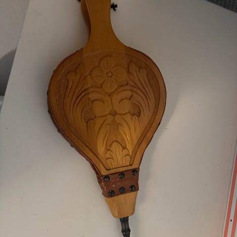 Antikk peisbelg i tre og lær – dekorativ og funksjonell