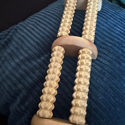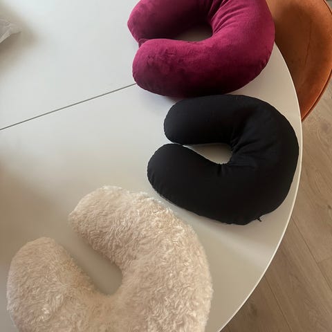 FeetUp yogakrakk i tre med hvit polstret pute. Konstruksjonen består av buede ben i tre og en U-formet, godt polstret sitte- og støtteflate i kunstskinn eller lignende materiale. Krakken er laget for å brukes til omvendte stillinger og støtteøvelser i yoga og annen trening, der skuldre og hode kan avlastes mot den myke puten mens vekten fordeles mot rammen. Egner seg til hjemmebruk, yogastudio eller annen rolig trening der man ønsker stabil støtte i ulike posisjoner.