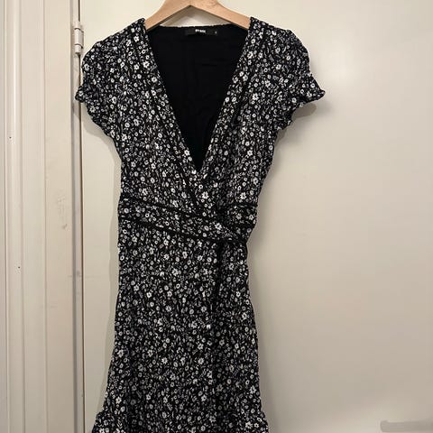 Lang gul kjole med blå blomster fra Bikbok i størrelse XS. Aldri brukt av meg. 100kr