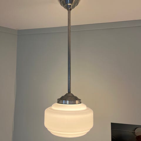 Hengende lampe i nydelig gyllent farget glass som gjør at lampes skinner dempet og fint.