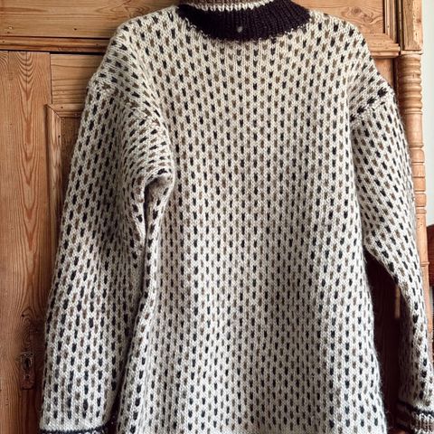 Flott vintage genser i ull, håndstrikket i kraftig og tung ull av høy kvalitet, perfekt for kaldt klima og norsk vinter. Dette er en solid strikkegenser med god tyngde og varme, ideell både til hverdags, hyttebruk og friluftsliv.