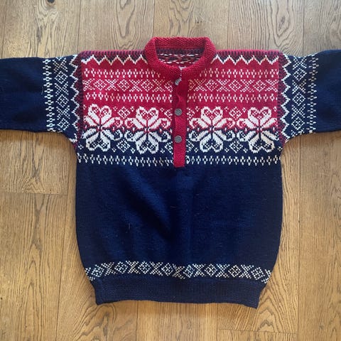 Helt ny hjemmestrikket Marius genser. Strikket i Peer Gynt ullgarn fra Sandnes Garn. Selges da den ble for liten for den som den var ment for.