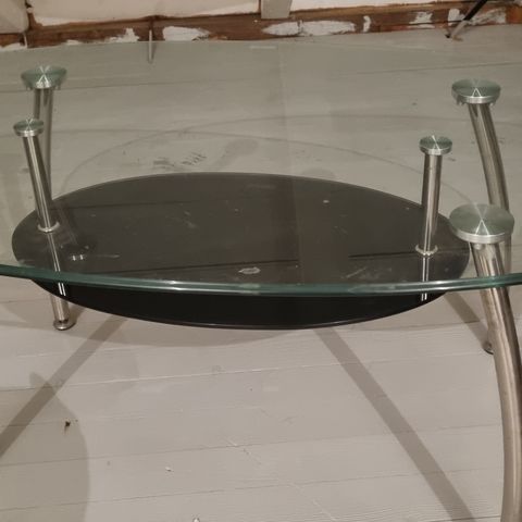 Lite sidebord i glass med gullramme og små hjul. I god stand.