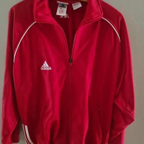 Jeg selger en Adidas treningsdress for herre i størrelse M. (38/40). Jakken har hel glidelås foran og høy krage. Hovedfarge er rød med blå ermer og hvite striper på overarmene. To sidelommer med glidelås. Materiale fremstår som myk tekstil med lett stretch.