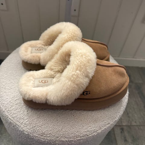 UGG tøfler i størrelse 38. Modellen er en slip-on tøffel med overdel i brunt semsket skinn og mykt, fôret innvendig materiale. Sålen er kraftig med mønster for bedre grep. Egnet som innesko eller lette sko til bruk ute på tørt underlag.