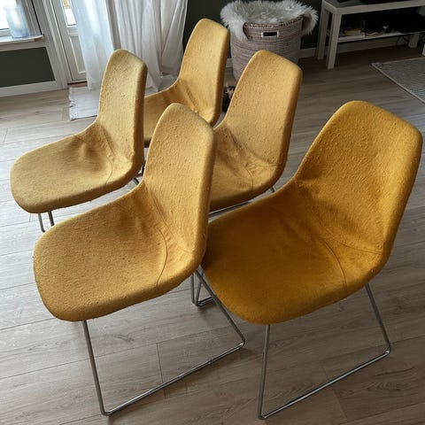 2 stk solide og stødige barstoler gis bort. Stygge og slitne på overflaten, men gode å sitte på. Jeg har brukt et saueskinn for å dekke de.