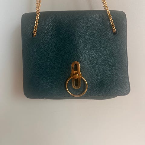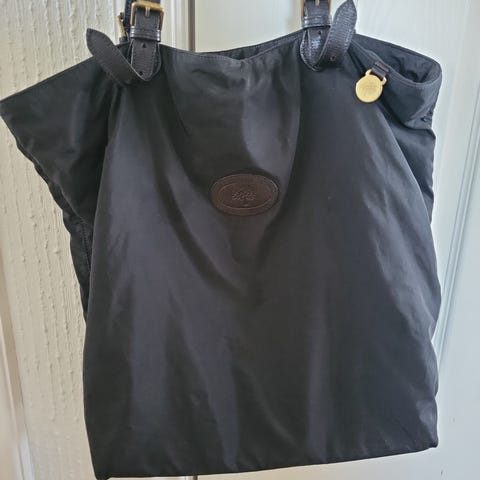 Mulberry skinnveske for dame i svart lær. Vesken har doble hanker og avtagbar, justerbar skulderrem. Forsiden har to utvendige "lommer" med klaff og metallspenner, samt metallbeslag og ringer i gullfarget metall. Baksiden er glatt med en mindre detalj i metall. Innvendig har vesken hovedrom og lomme. Egnet som hverdagsveske eller jobbveske med god plass til personlige eiendeler.