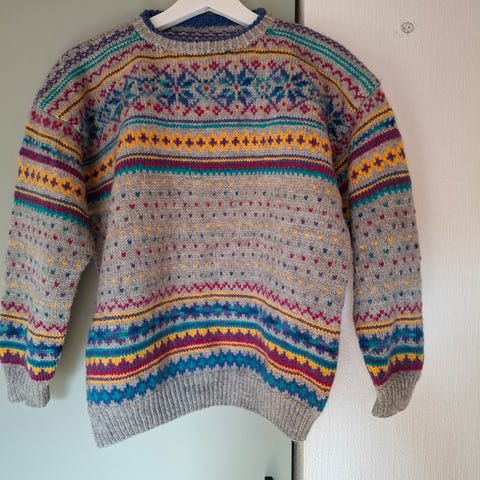 Selger ein nydeleg håndstrikka genser i ull🌟. Smal og str. S, strikka til tenåringsjente /ungdom på 80-tallet. Pent brukt, selges for kr 700 🌺.