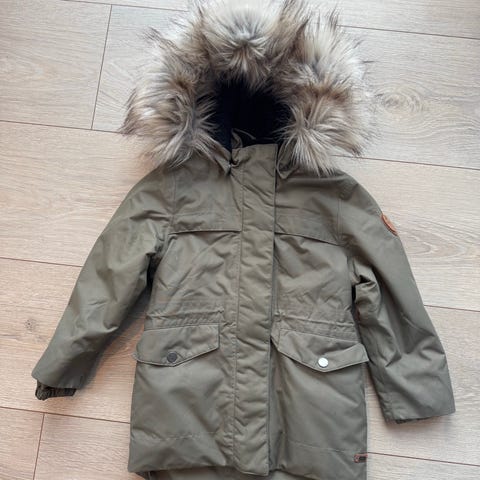 Pent brukt Vinterjakke type Reima Lunta str 146, farge; mørk grønn. Meget varm og god jakke. Vi har hatt denne typen i flere størrelser. Datteren min er alltid varm og god med denne jakken som rekker ned til lårene. Stor og god hette, som er avtakbar med trykknapper. Reflekser, lommer med glidelås foran og innerlomme med glidelås. Noen små svake striper i stoffet noen steder hvis man ser nøye etter, men ingen hull el. Fortsatt en fin jakke med mye bruk igjen!