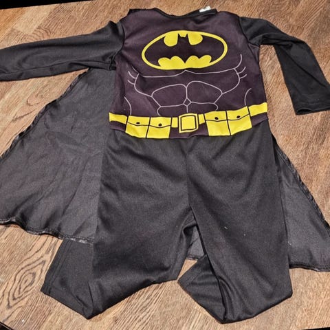 Selger et godt brukt Batman-kostyme i størrelse 116. Fin maske medfølger. Har drakt, kappe og maske.