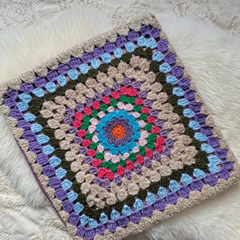 2 putetrekk, heklet på den ene siden, lukket med glidelås. Størrelse: 46 x 46 cm.