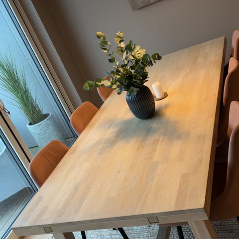 Utrolige fint og solid bord i heltre. Lengde 160cm, følger med en ekstra innleggsplate på 50cm, fult lengde 210cm. Noen små brukes merker, man kan helt fint leve med :)