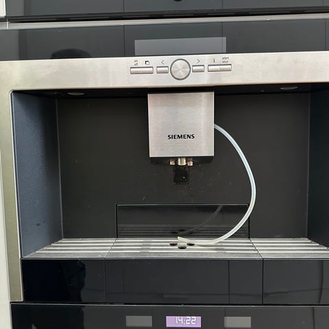 Siemens kaffemaskin for innbygging i kjøkken. Maskinen er i rustfritt stål og har frontpanel med knapper for betjening. Utstyrt med justerbart kaffetut og separat damparm for skumming av melk. Dryppbrett og avtagbar rist i front. Strømtilkobling 220–240 V, 50 Hz, effekt 1300 W. Produsert av Eugster/Frismag AG i Sveits. Egnet som innebygd kaffemaskin i kjøkkeninnredning for tilberedning av kaffe og espressobaserte drikker.