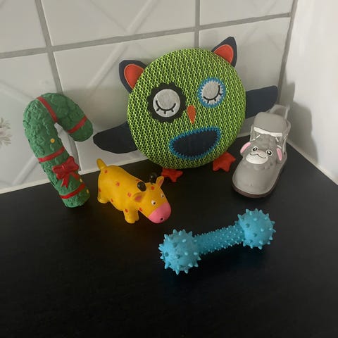 Pakke med diverse hundeutstyr og aktivitetsleker.