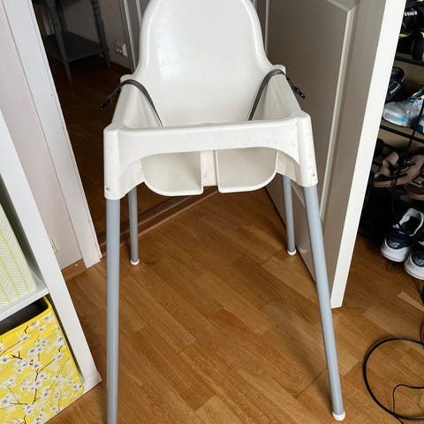 IKEA høy barnestol i hvit plast med metallben. Stolen har enkel sitteenhet med ryggstøtte og sikkerhetssele. Egnet som spise- og sitteplass for små barn ved bord. Lett konstruksjon som er enkel å flytte og rengjøre.