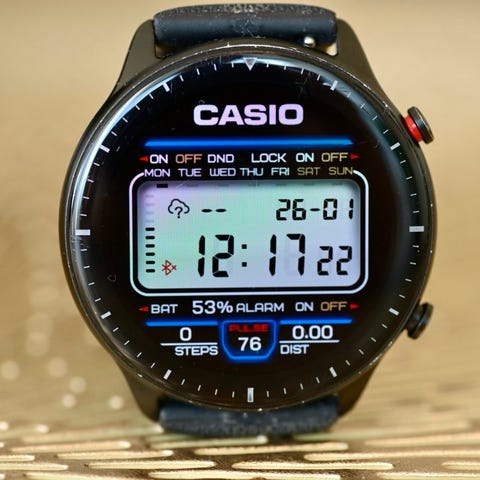På baksiden finnes sensorer for måling mot hud, samt ladepunkter for magnetisk lader. Klokken viser typisk smartklokkefunksjoner som tid, dato og aktivitetsinformasjon på skjermen.