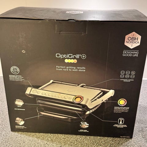 Kontaktgrill i bordmodell med lokk i metall og riflede grillplater. Grillen har over- og undervarme som presses sammen rundt maten. Egnet til grilling av for eksempel toast, panini, grønnsaker, fisk og kjøtt. Grillplatene er riflet for grillmønster og enklere avrenning av fett. Strømindikatorlys på lokket viser når grillen er i bruk.