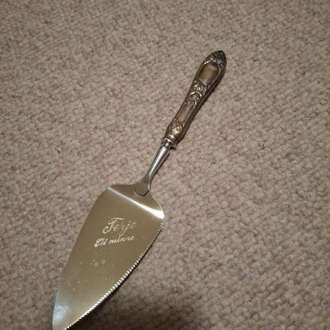 Kakespade i Opphøyd Rose mønster i sølv. Pent brukt Egnet til servering av kaker og paier. Passer til bruk ved borddekking til hverdag og selskap.