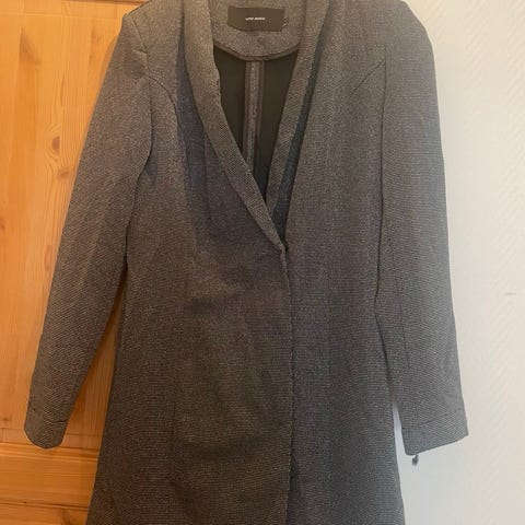 Vero Moda kåpe for dame i størrelse 46. Kåpen er grå og laget i polyester. Modellen har rett fasong med rund hals og glidelåslukking foran. To skrålommer med klaff og knapp foran. Lengden går ned mot midten av låret, og passformen er romslig nok til å brukes over gensere eller andre plagg.