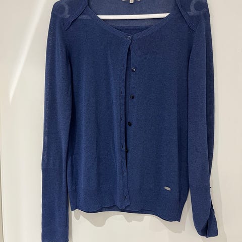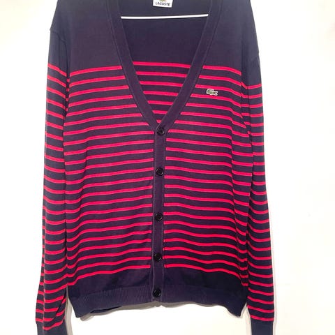 Lacoste cardigan for dame i størrelse 42. (Vil si 40/42).Cardiganen er rød og strikket i 100 % ull. Modellen har V-hals, knepping foran og Lacoste-logo på brystet. Passer som varm og lett ytterdel eller mellomlag. Kan sendes mot porto