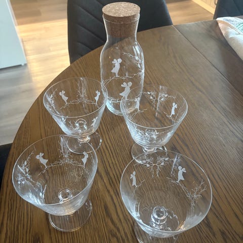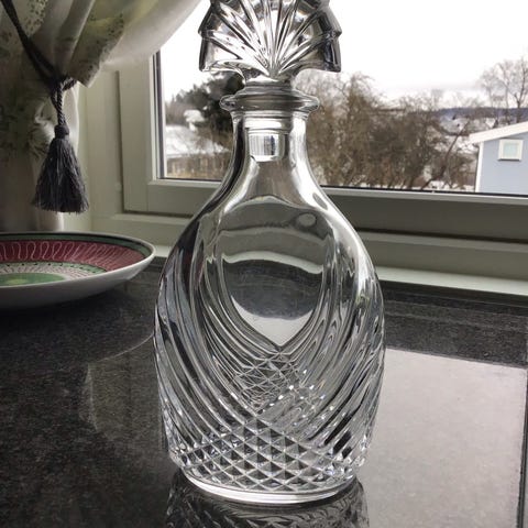 Sett med to karaffeler i klart glass med gravert blomstermønster. Begge har rund, bred bunn og smal hals. Høyden er omtrent 23–24 cm, som vist ved siden av linjal på bildet. En av karaffelene har et hakk/skade i kanten øverst på tuten. Prisen er for den ene karaffelen, mens den med hakk/skade, kan fås med gratis, om ønskelig. Egner seg til servering av vin, vann eller andre drikker, eller som dekorative glassobjekter.