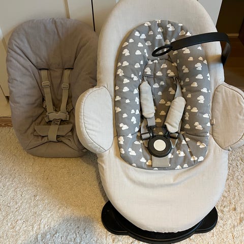 Pent brukt Stokke Steps vippestol med babyinnlegg og avtagbar leketøyshenger.