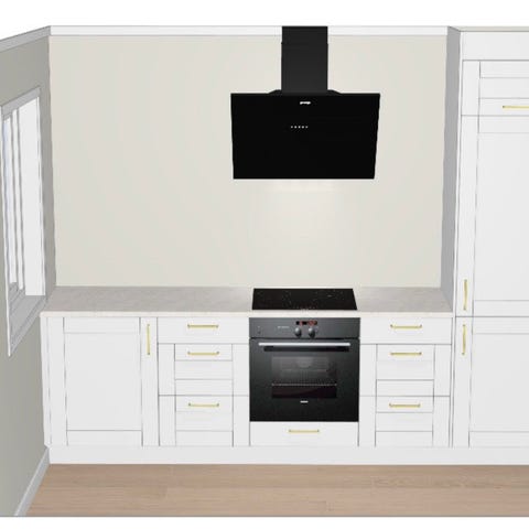 Hvit kjøkkeninnredning med fronter, benkeplate og overskap
