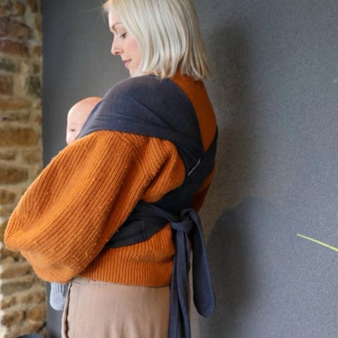 Caboo bæresjal i grå farge. Sjalet er laget i bomullsmiks, ifølge vaskelappen 52 % bomull og 48 % polyester. Det har integrerte ringer for justering og tilpasning. Egnet til å bære baby tett inntil kroppen, med mulighet for ulike bæreposisjoner etter behov og barnets størrelse innenfor produsentens anbefalinger. Kan vaskes i maskin etter anvisning på lappen.
