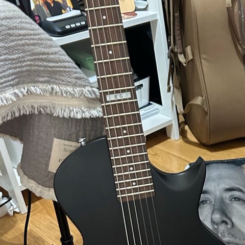 Har korrigert og polert bånd. Justert og intonert. Den er satt opp med 010-052 for D standard/drop C.