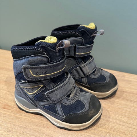 Ecco vintersko for barn i størrelse 28, unisex-modell. Skoene er i hovedsak mørk blå med detaljer i gult og grått. Overdelen kombinerer tekstil og syntetisk materiale med forsterkninger på tå og hæl. Modellen har to borrelåsstropper som gjør det enkelt å ta skoene av og på. Lett synlig bruk på skotuppene ellers godt bevart