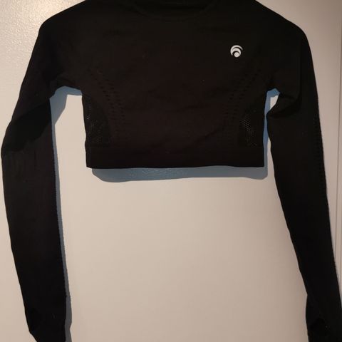 Famme treningstopp for fitness i str. S. Langermet, kort modell i svart farge. Toppen er laget av polyamid og elastan, som gir et elastisk og kroppsnært plagg. Egnet til ulike treningsformer og aktivitet innendørs og utendørs.