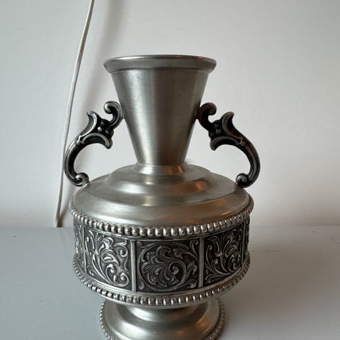 Fin tinngjenstand med vridd hank og myk, bølget kant. Klassisk og enkel form som passer godt som pynt, til småting, eller som del av en samling. Kan også brukes til tørkede blomster eller som dekor på bord/hylle.