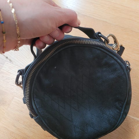 Svart rund veske som ser ut som en klokka av ukjent merke. Helt ny og ubrukt