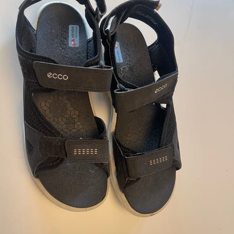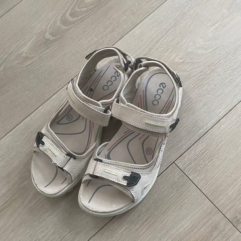 Modellen er åpne sandaler med justerbare borrelåsremmer over fot og rundt hæl.