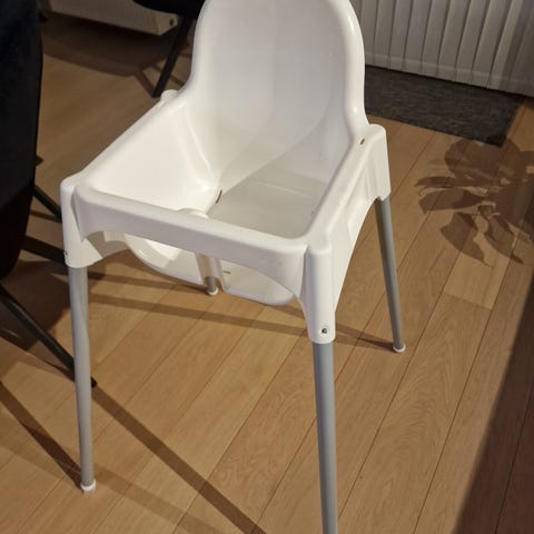 IKEA høy barnestol i hvit plast med grå metallben. Stolen har integrert sikkerhetsbelte i setet. Setet er formet med høy rygg og kanter for bedre støtte til barnet. Egner seg for små barn som kan sitte selv, ved spisebord eller andre bordhøyder der en høy barnestol er praktisk. Lett konstruksjon som gjør stolen enkel å flytte og rengjøre.