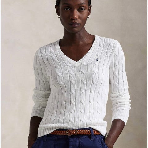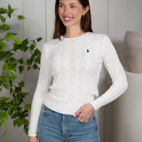 Vurderer å selge en helt ny bomullsgenser fra Ralph Lauren i nydelig flettet strikk i off-white farge.