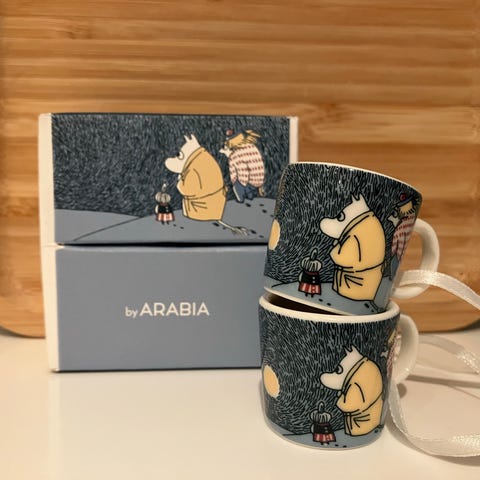 Minikoppene har silkebÄnd pÄ hver kopp, sÄ de er superfine bÄde som pynt pÄ juletre, gavepakker og dekorasjoner. Koppene er helt nye og ubrukte, info pÄ storkoppene er hentet fra Moominmugs.com..