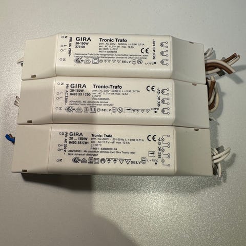 Produktet er merket med CE-symbol og tekniske data direkte på huset, inkludert effektområde og tilkoblingsinformasjon. Passer for brukere som trenger en elektronisk transformator til lavvolt belysningsanlegg fra Gira i dette effektområdet.