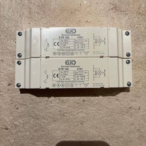 Transformatoren er beregnet for lavvolt belysning med en effekt på mellom 35 og 105 watt. Den har kompakt, rektangulær form og er merket med tekniske spesifikasjoner og tilkoblingssymboler på oversiden. Enheten er egnet for bruk i innendørs installasjoner der det er behov for stabil strømforsyning til kompatible lysarmaturer.
