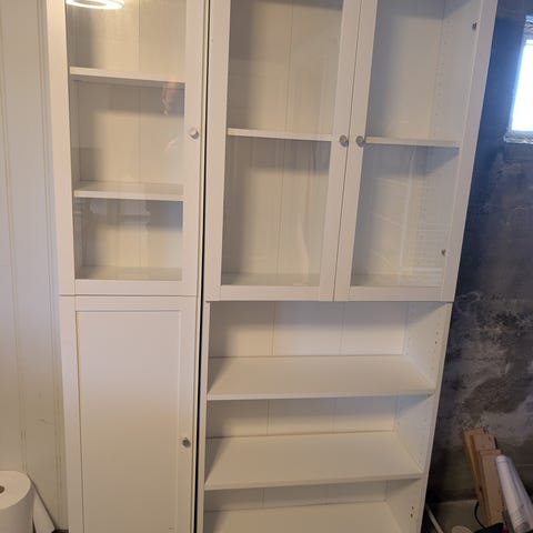 Gir vekk 2 skap som har blitt brukt på bad. Det er glasshyller i skapene,både oppe og nede,pluss hyllen på midten. Må hentes,sender ikke. "Første mann til møllen".